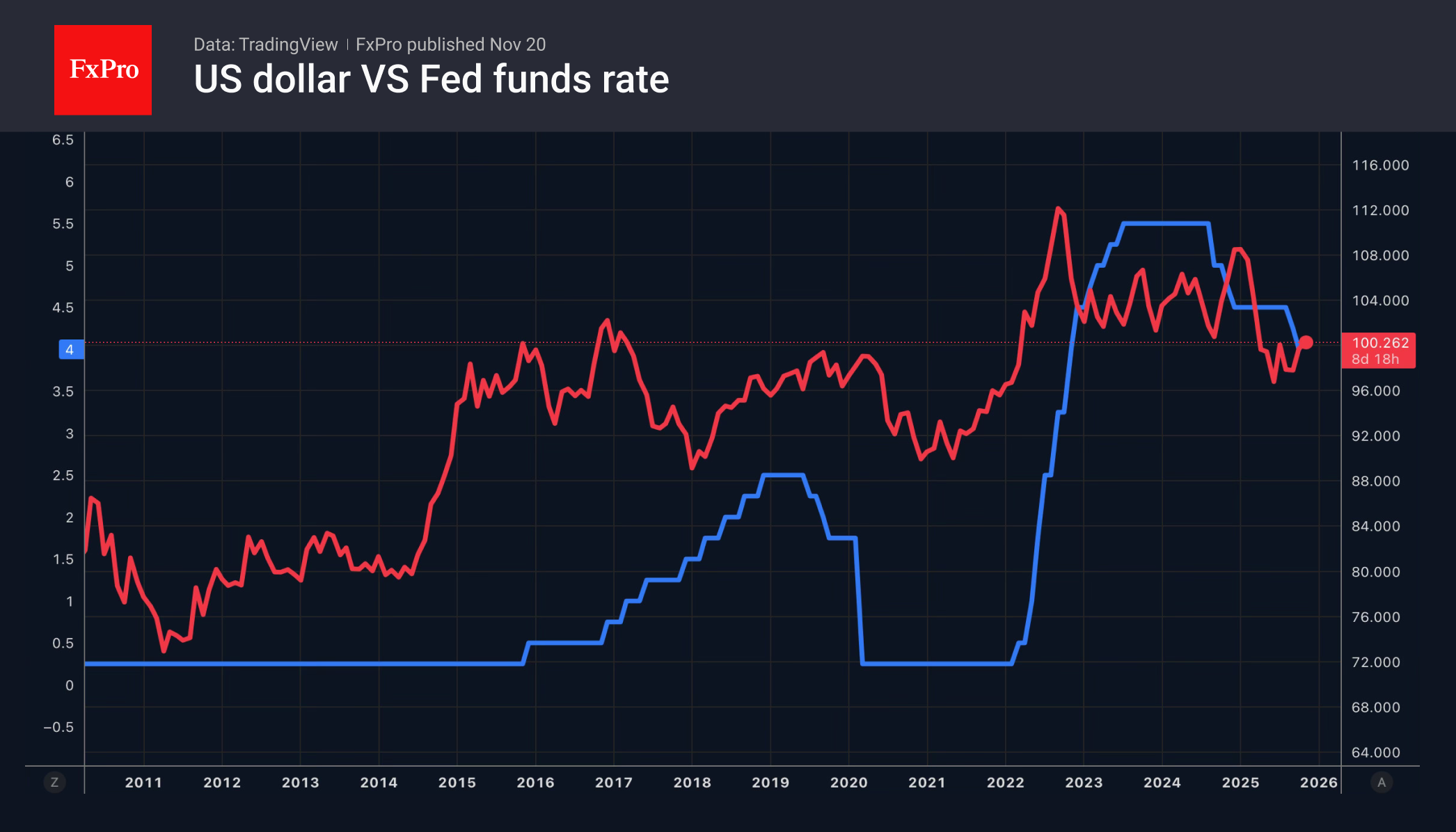 The White House's pressure on the central bank was one of the drivers behind the 10% fall in the USD index in the first half of the year. Donald Trump then eased his grip as the Fed cut rates in September and October. The Fed's shift to a wait-and-see position has put pressure back on Trump's agenda, which translates into pressure on the dollar.