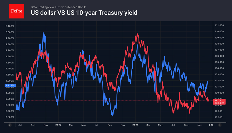 The likelihood of a key rate cut in January has decreased from 25% to 20%, and the futures market does not anticipate a cut until April. Consequently, the decline in the dollar appears excessive. Another factor influencing this is the robustness of key competitors. Officials at the ECB and the Reserve Bank of Australia have not ruled out tightening policy as early as 2026, while former Bank of Japan chief economist Hideo Hayakawa mentions the possibility of four rate hikes by the end of 2027.