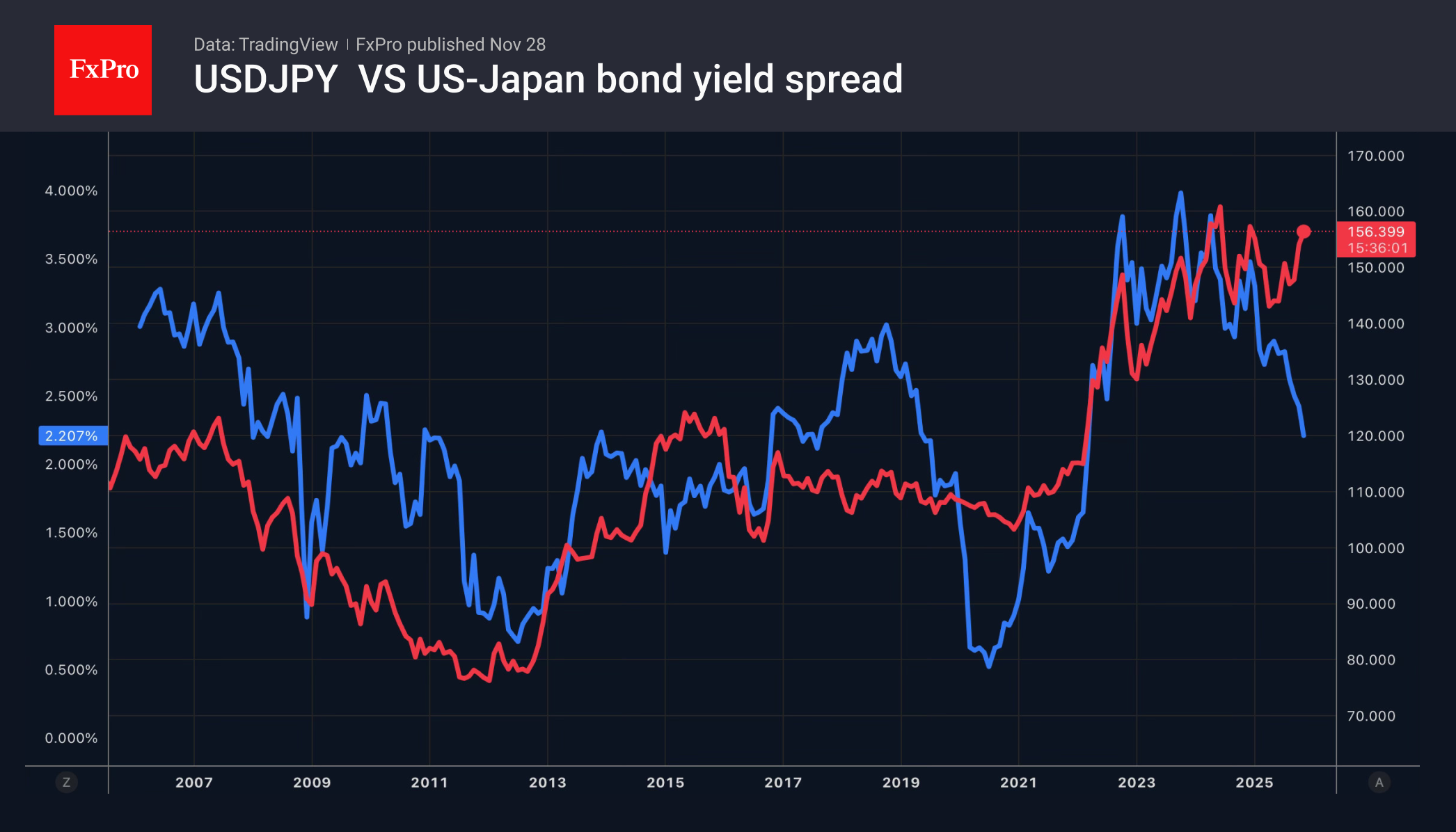 Divergence in monetary policy could make the yen the favourite for 2026. The futures market expects the overnight rate to rise by 75 basis points by the end of next year.