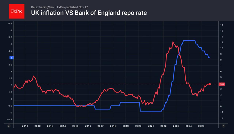The pound has been fluctuating within a range of just over 100 points for the tenth day. A busy economic calendar and expectations of tax increases are pushing GBPUSD up and down. The Bank of England has claimed that 3.8% is the peak of inflation. However, the release of CPI data for October may show an acceleration, contrary to average forecasts of a slowdown to 3.6%. This will reduce the chances of a sharp cut in the key rate in December and provide support for the pound, albeit temporarily.
