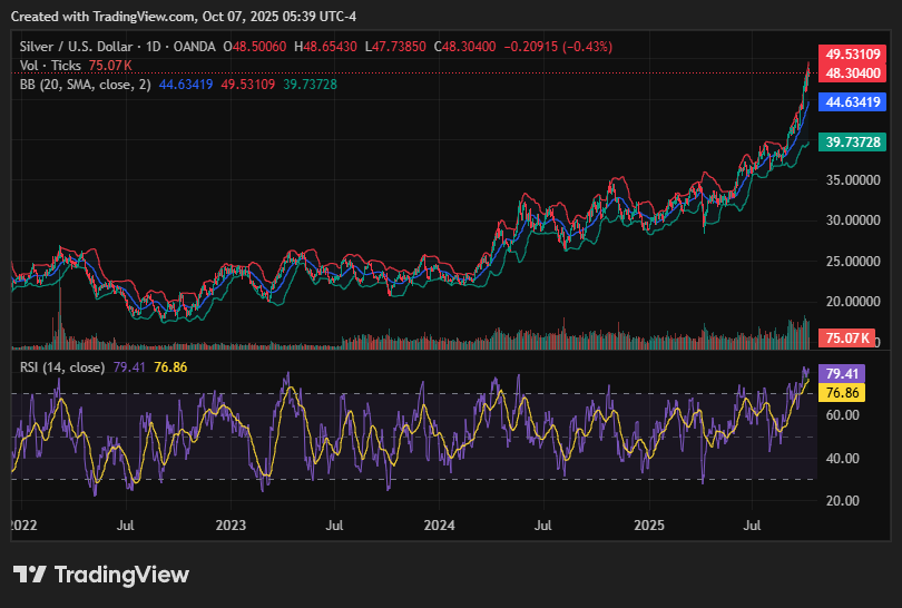 Silver (XAG/USD) slipped below the $48.50 level after briefly touching a fresh 14-year high earlier this week. The renewed strength in the US Dollar and profit-taking from recent highs have led to modest downside pressure, though the broader uptrend remains intact.