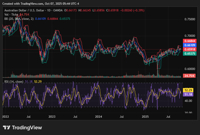 The Australian Dollar steadied after earlier losses, holding near 0.6420 as the US Dollar regained ground. Traders are balancing weak Westpac Consumer Confidence data against steady global risk appetite and the ongoing US fiscal standoff.
