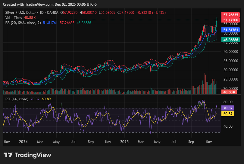 Silver has slipped below $57.00 as profit-taking emerges after its record-breaking rally. The metal remains broadly bullish but vulnerable to short-term corrections.