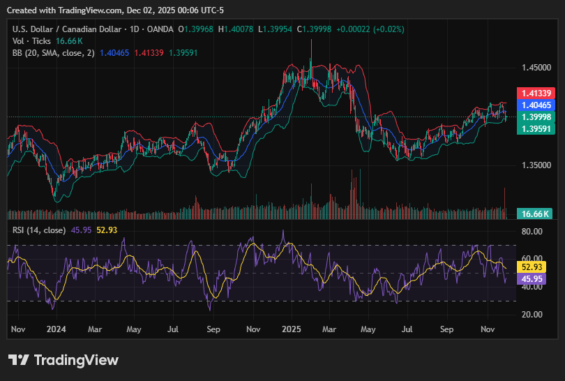 USD/CAD trades near 1.4000, maintaining recovery momentum as lower oil prices continue to weigh on the Canadian Dollar. Despite broad dovish Fed bets, the pair remains supported by commodity-driven weakness in the CAD.