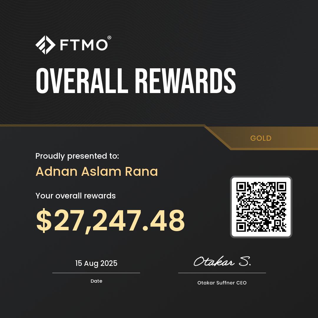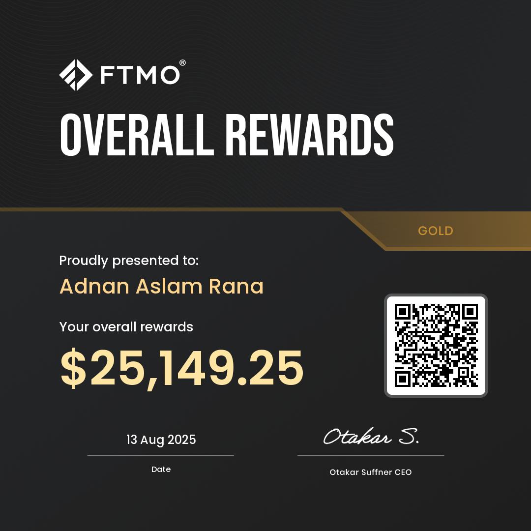 -Phase 1 passed on 11-11-2024 and Phase 2 passed on 27-11-2024100k scaled +25% by FTMO and payout ratio also scaled to 90:10. (27-5-2025)-Total Payouts: $13485-Total No. of payouts: 7 (As of 12-6-2024)
