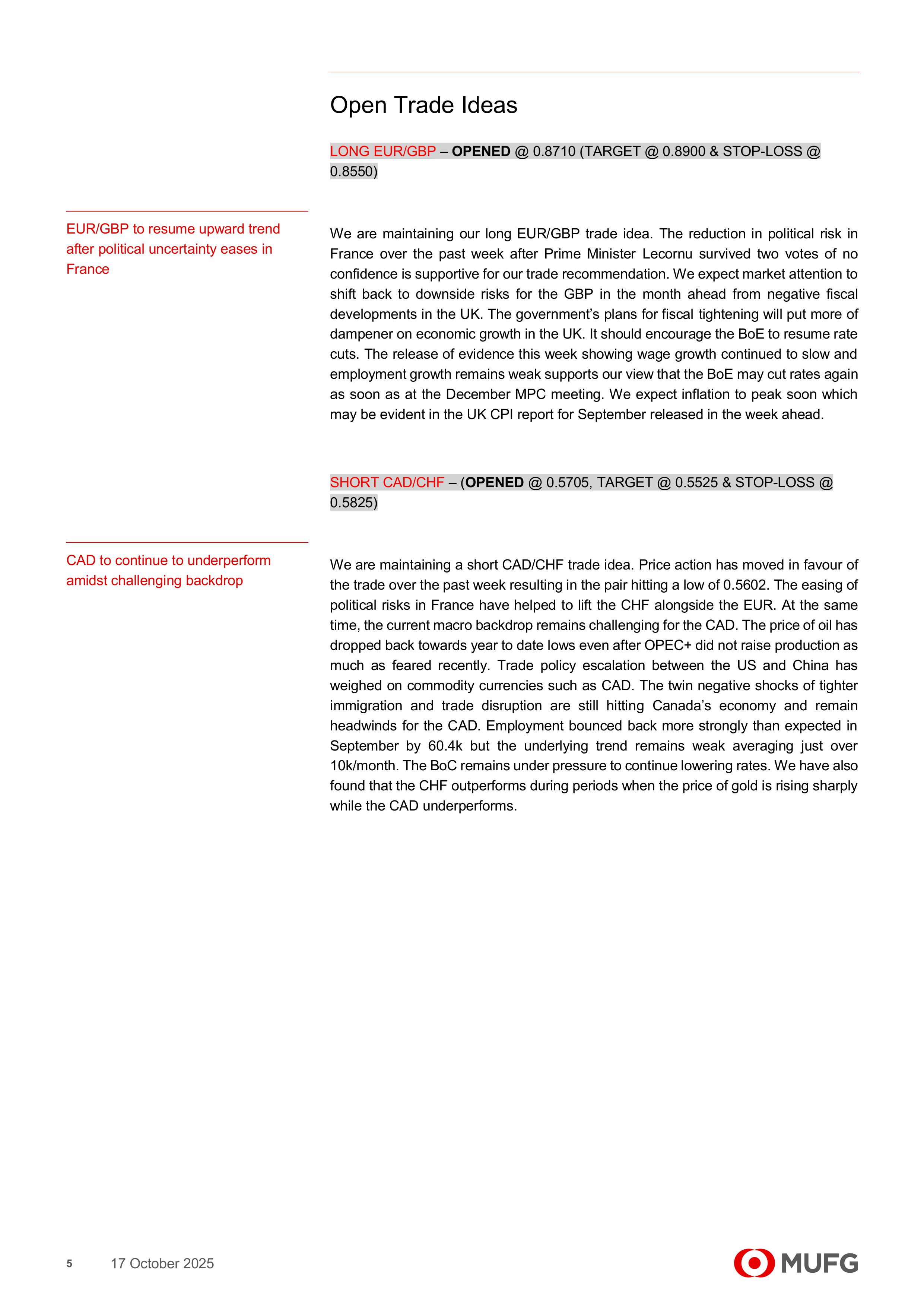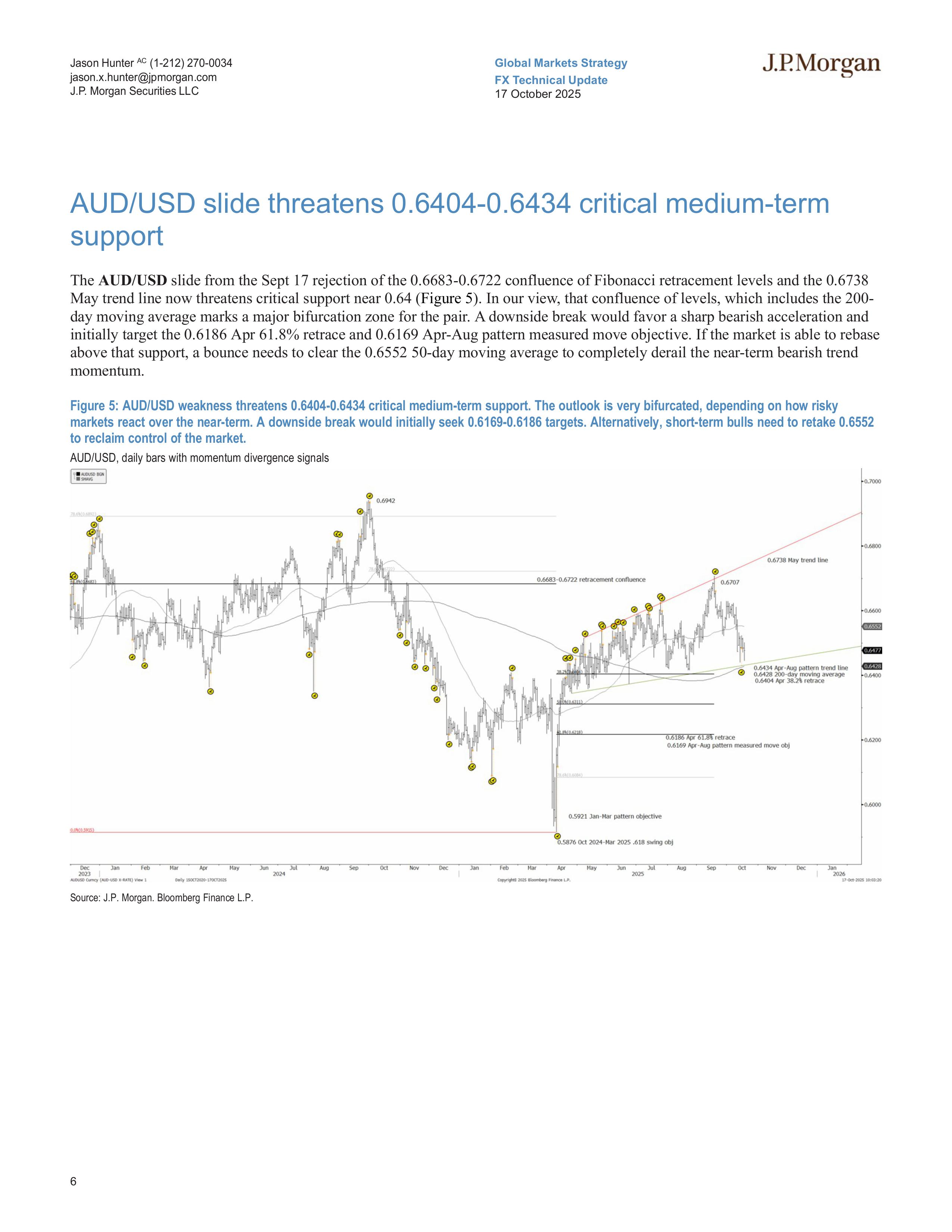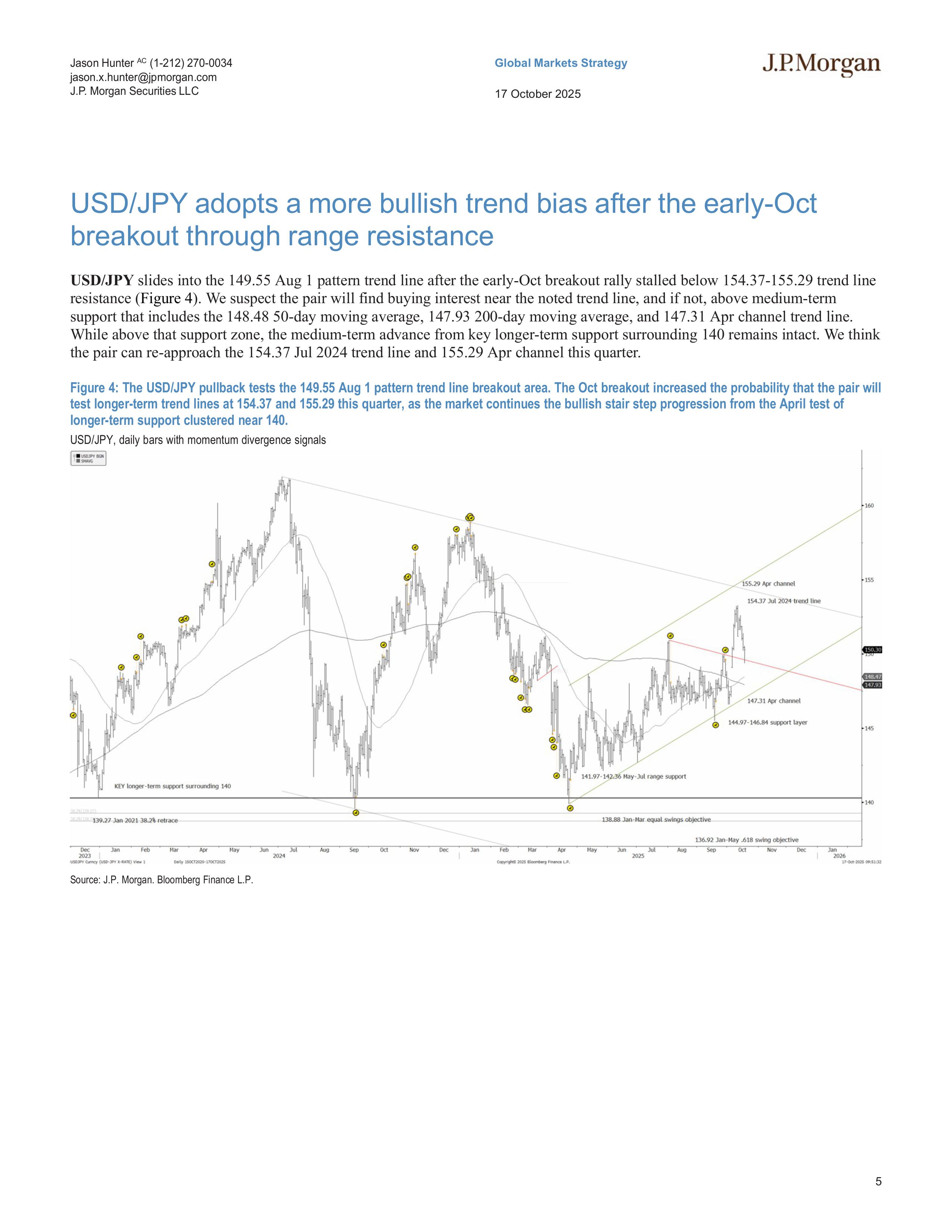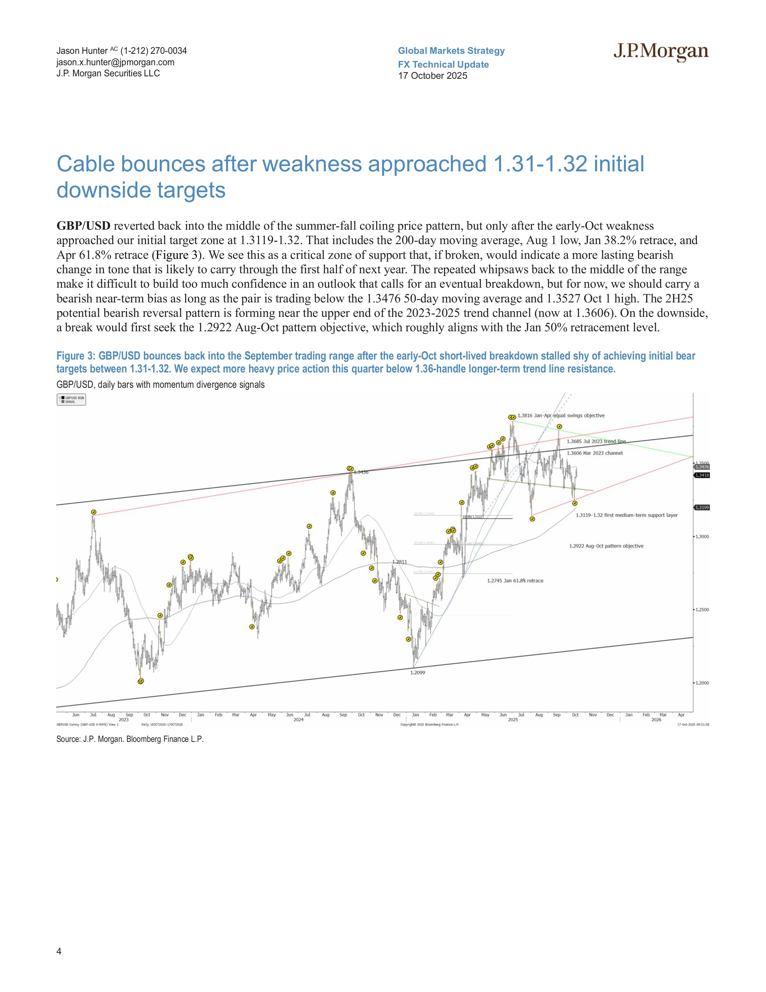 JPM: GBP/USD has bounced back into the September trading range after the early October breakdown briefly paused just before reaching initial bear targets between 1.31 and 1.32. We anticipate significant price movement this quarter below the 1.36 handle, facing long-term trend line resistance.
