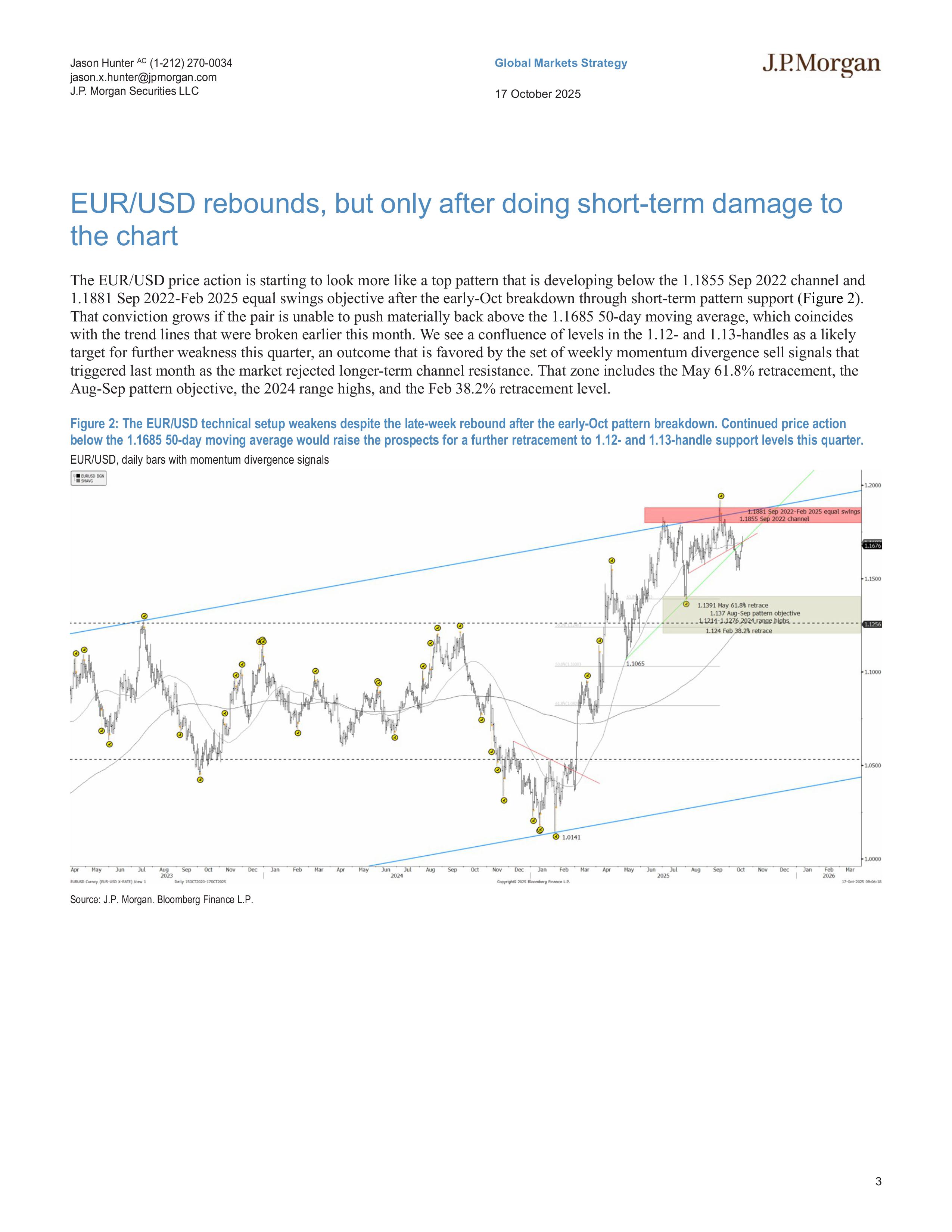 JPM: The EUR/USD technical setup weakens despite the late-week rebound after the early-October pattern breakdown. Continued price action below the 1.1685 50-day moving average would raise the prospects for a further retracement to 1.12 and 1.13 support levels this quarter.