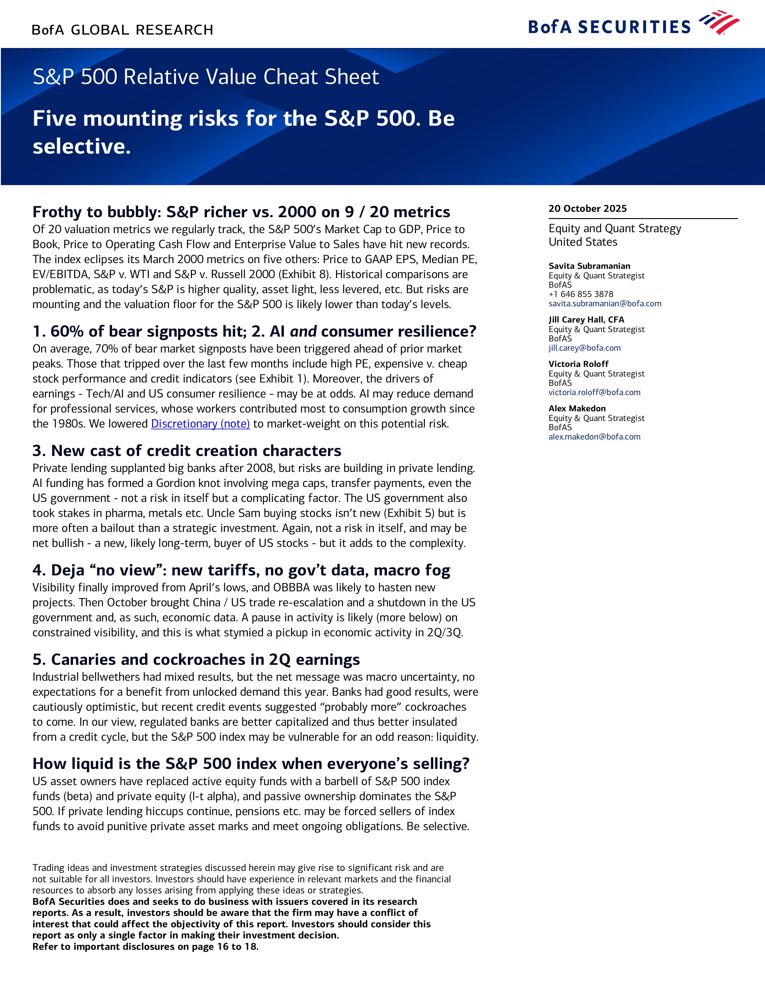 Bofa(Bank of America): S&P 500 Relative Value Cheat Sheet