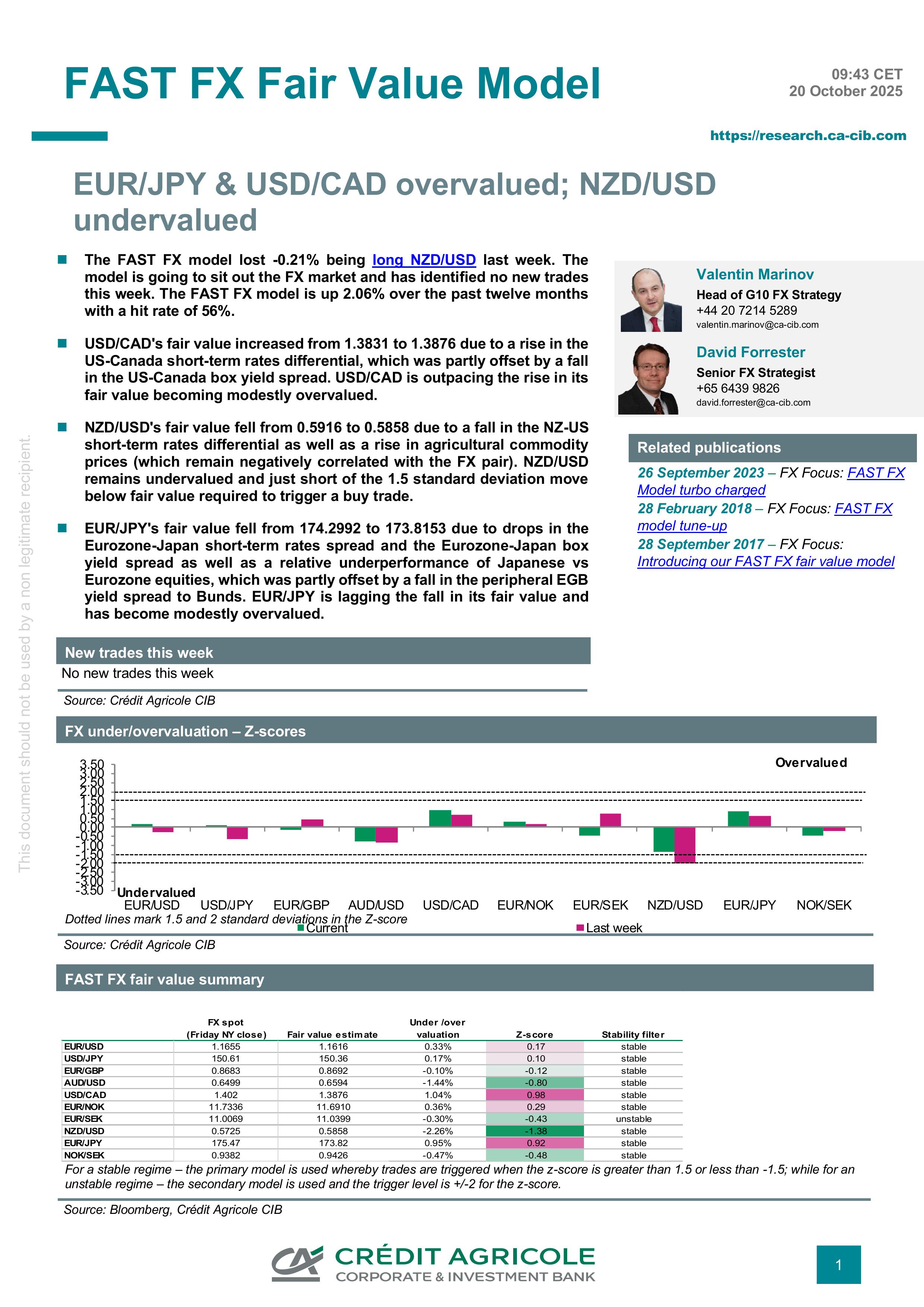 Credit Agricole: FAST FX Fair Value Model: EUR/JPY & USD/CAD overvalued; NZD/USD undervalued.