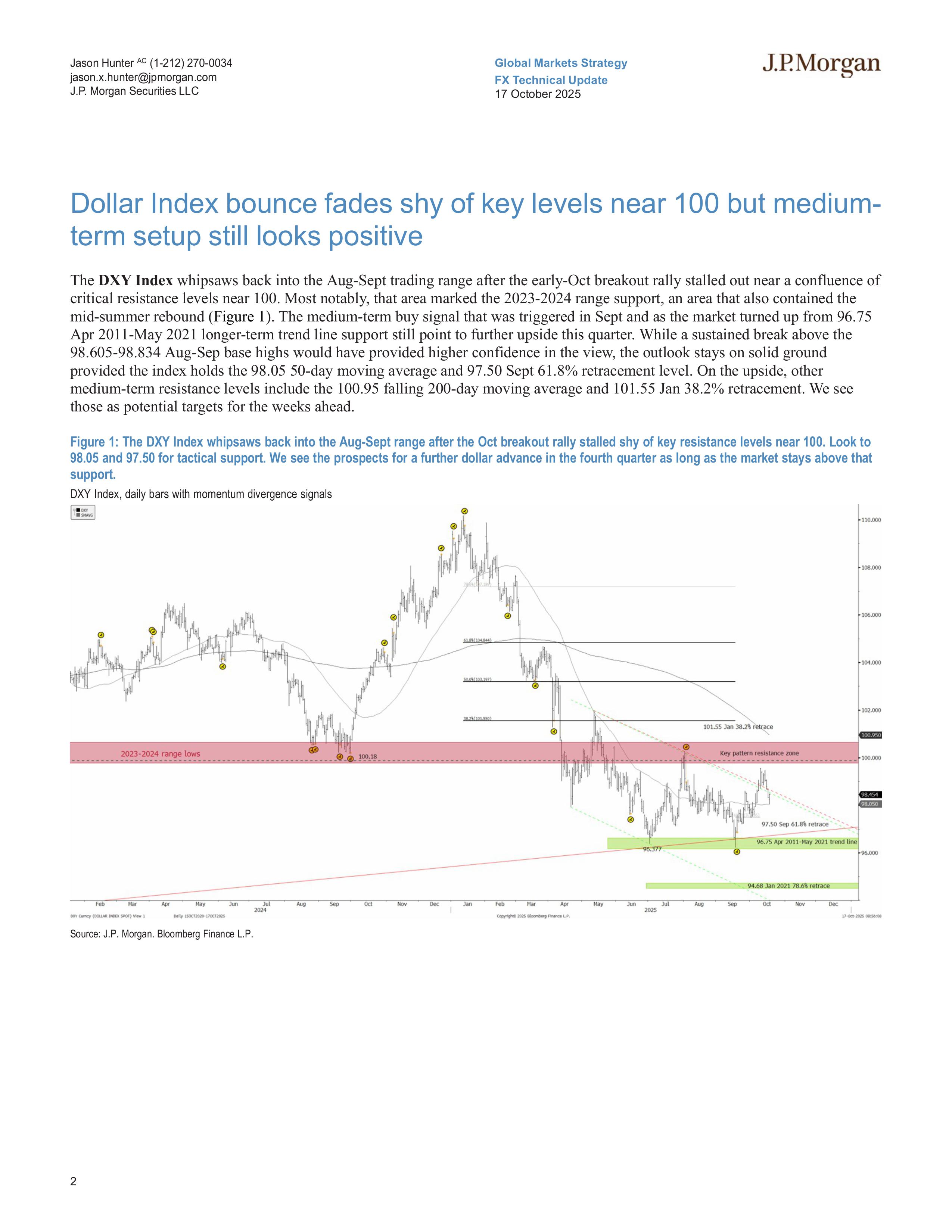 JPM: The DXY Index fluctuates back into the August-September range after the October breakout rally stalled just below key resistance levels near 100. Look to 98.05 and 97.50 for tactical support. We see the potential for a further dollar advance in the fourth quarter as long as the market remains above that support.