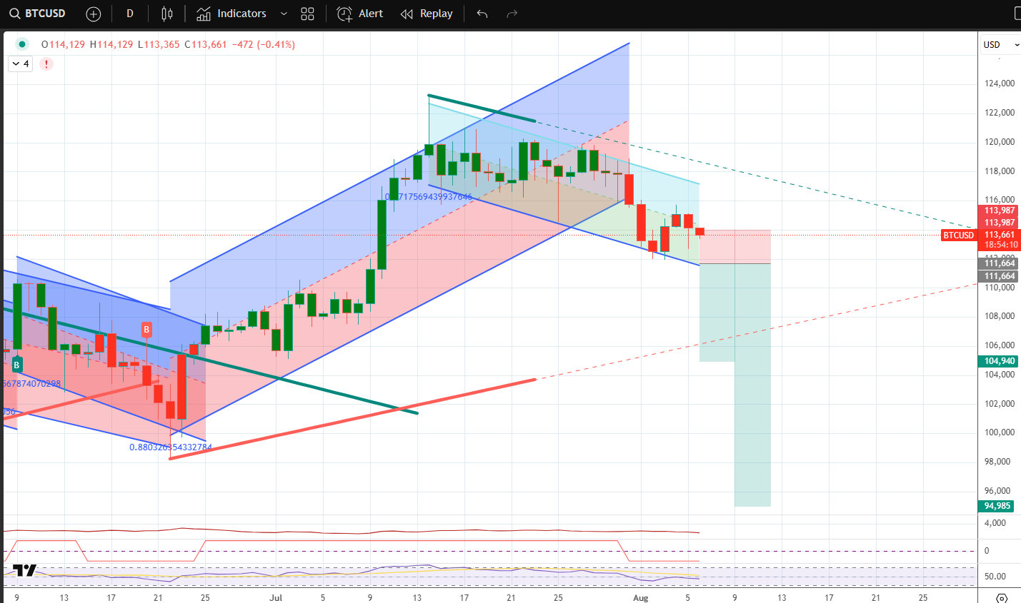 Entry: Sell on a clean break and close below $111,800.Target 1: $105,000Target 2: $95,000Stop Loss: Above $114,000Reason: A strong move below $111,800 could trigger stop losses and a further unwinding of long positions, opening the path for deeper downside.