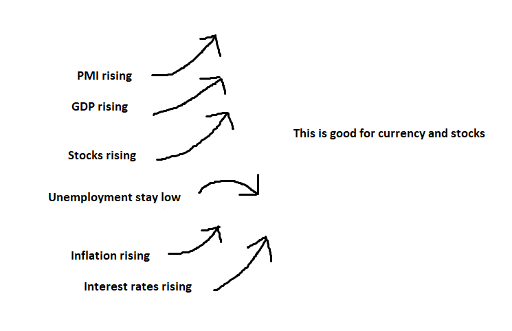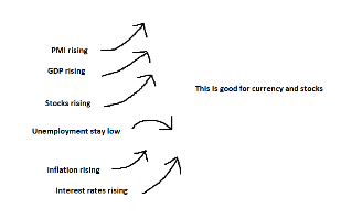 PMI gives a leading signalLow unemployment confirms economic growthGDP is the result of workInflation goes hand in hand with economic growth, as wages rise, prices rise, and businesses emergeAs a result, the Central Bank responds by raising rates to calm inflation