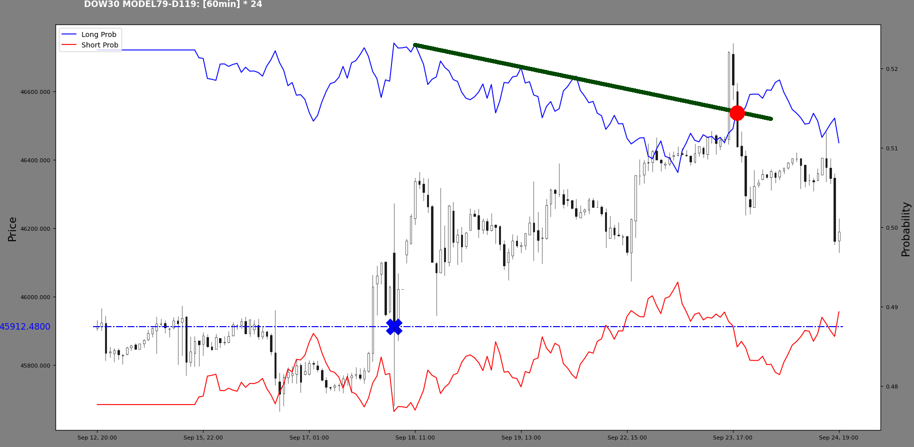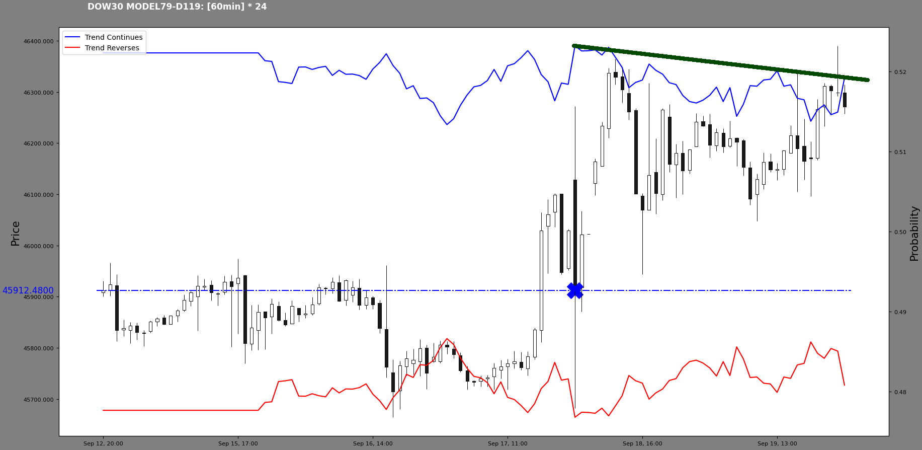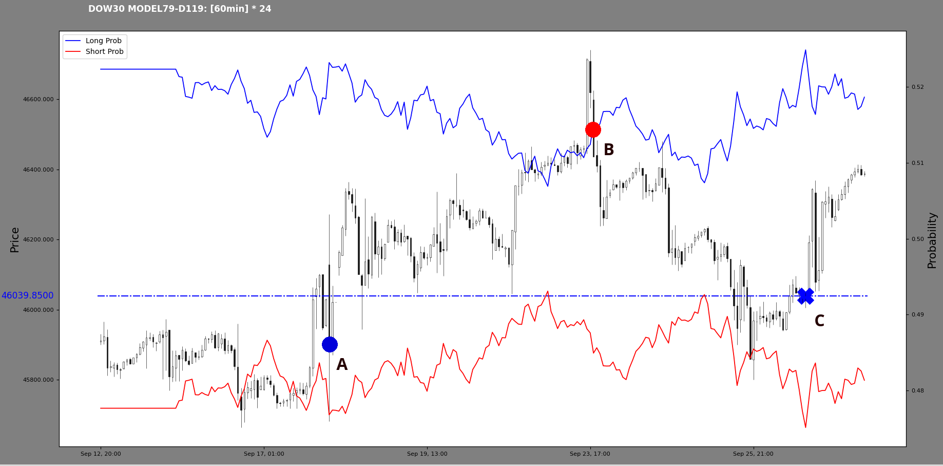 In the meantime, the index has formed a new high at 46039.85. So, following the timeline: there was a long prob high at A, then there was a probability structure break at B, which started a downturn. This was interesting to me, capturing the downturn from the probability structure break. Now we have a new long probability high at C. The A and C points lie on the candlestick structural line perhaps.