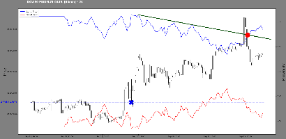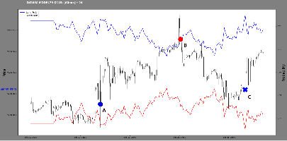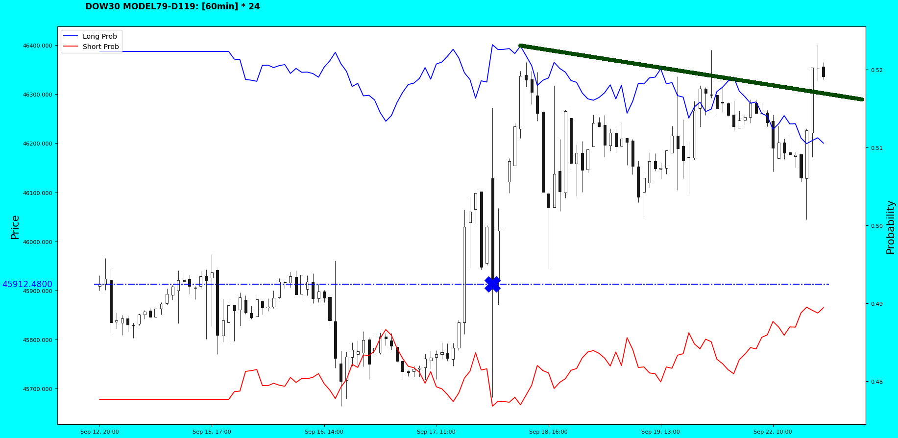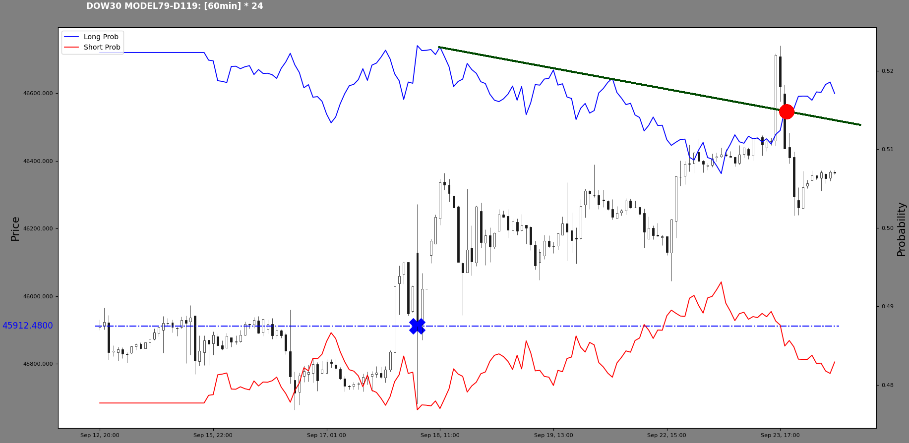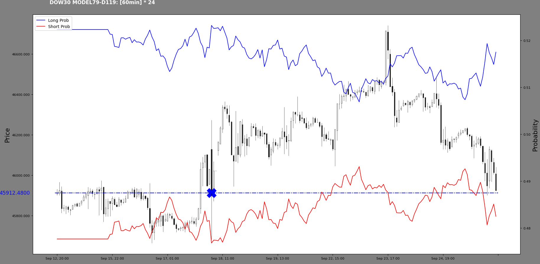 In the meantime, the index has formed a new high at 46039.85. So, following the timeline: there was a long prob high at A, then there was a probability structure break at B, which started a downturn. This was interesting to me, capturing the downturn from the probability structure break. Now we have a new long probability high at C. The A and C points lie on the candlestick structural line perhaps.