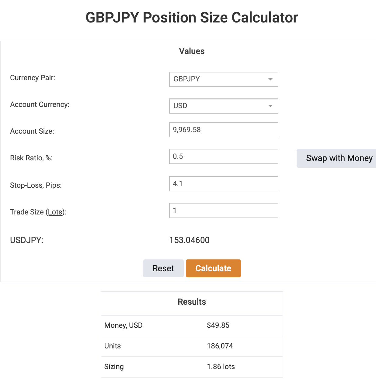 Hey All I am a new trader and I don't know where the error was here. My Prop account was at 9969.58 and I was risking 0.5% on a trade. I plugged the data including the stop loss size of 4.1 Pips into the calculator and it spit back out this information as shown in the image. The problem is when I opened the position with the information from the calculator for some reason I ended up risking WAYYYY More and I have no idea where Almost double. What was supposed to be a risk of $49.85 Turned into $75.00 and I have absolutely no clue as to what I may have done incorrectly.Prop firm: Equity EdgeAccount size at time of trade: 9969.58Stop loss: 4.1 pipsLot Size given: 1.86Risk in Dollars: $49.86Actual outcome $75.00 excluding commission.Please assist